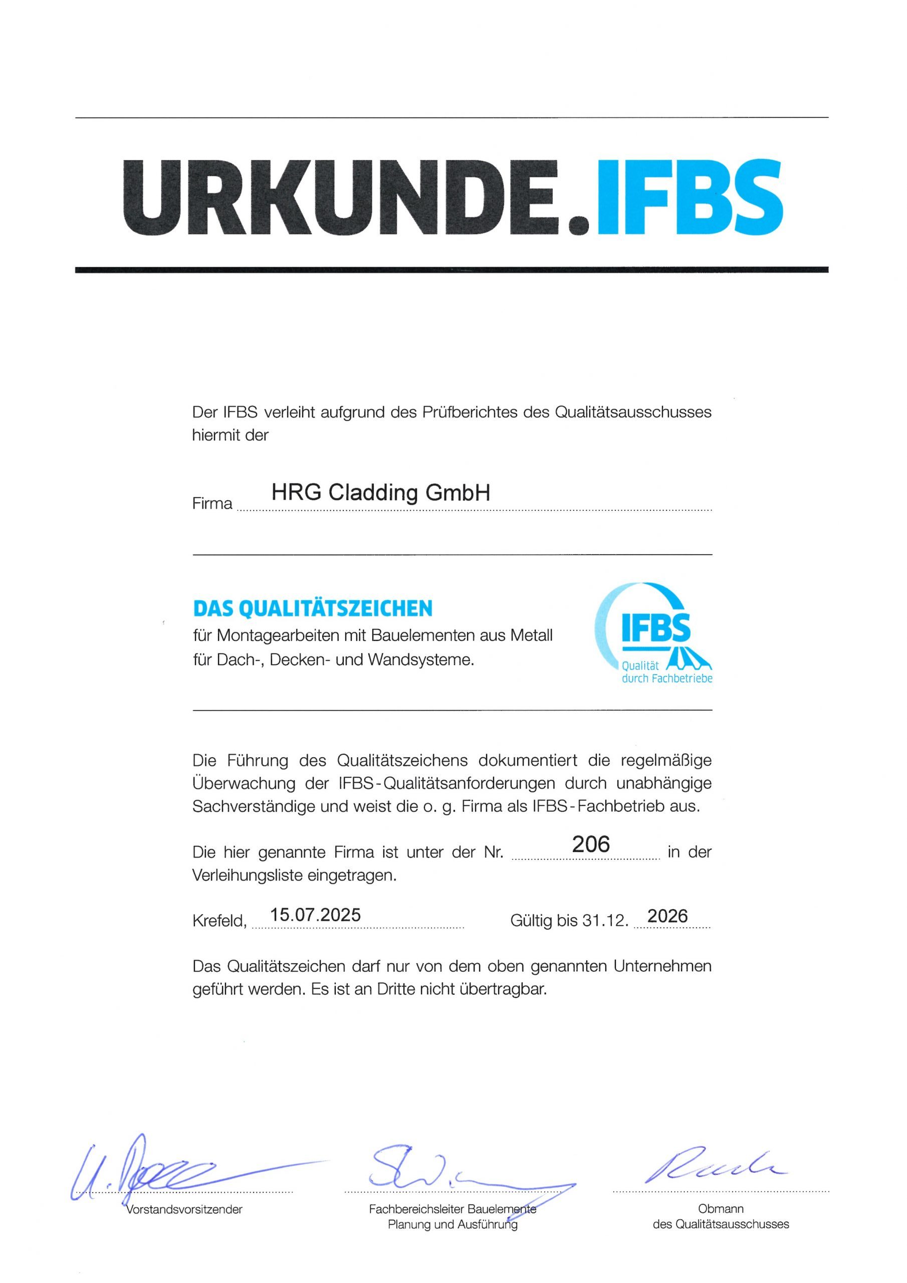 Um unser Qualitätsmanagement auf höchstem Niveau zu halten, sind wir Mitglied im Industrieverband für Bausysteme im Metallleichtbau (IFBS) und unterziehen uns einer jährlichen externen Qualitätskontrolle.